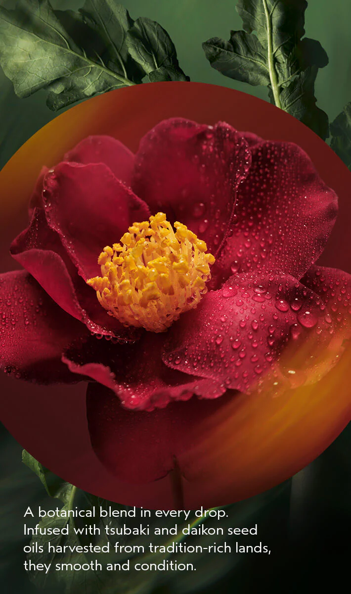 Tsubaki seed oil: Conditions. Hand-harvested in part from Jeju Island, a UNESCO World Heritage site, and consciously crafted through the traditional art of cold pressing—an extraction process free from chemical solvents.Daikon seed oil: Smooths. Responsibly sourced from cooperative farms in Willamette Valley, Oregon, that use natural rainfall and traditional crop rotation to help protect local water sources and support the long-term health and fertility of the land.